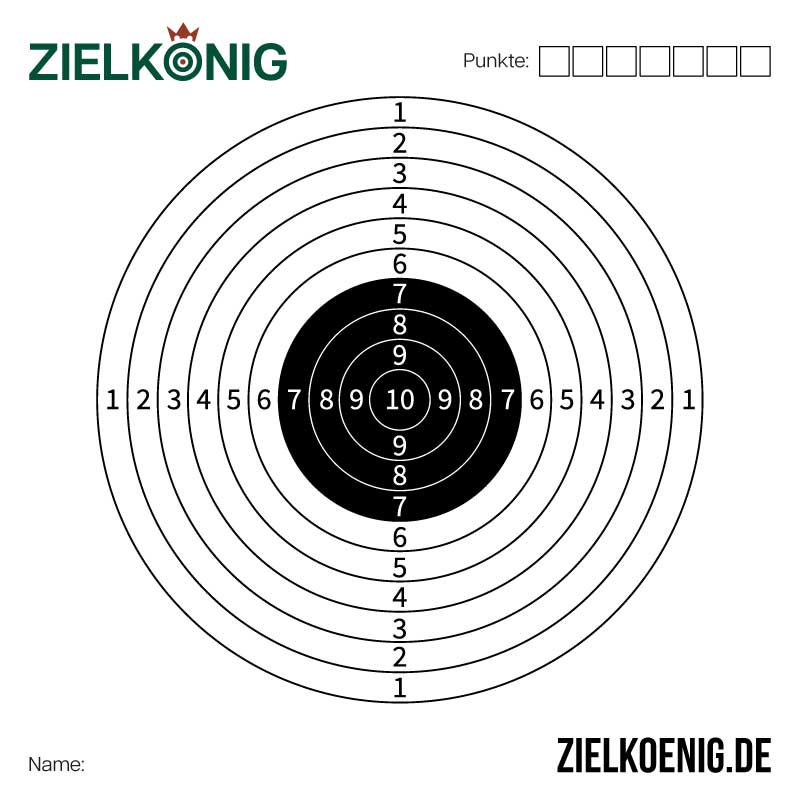 Diese kostenlose Zielscheibe bietet ein präzises, klassisches Ringdesign für alle, die eine zuverlässige Grundlage für ihr Training suchen. Die Zielscheibe ist mit Ringen von 1 bis 10 ausgestattet, wobei die 10 exakt in der Mitte liegt und durch eine schwarz hinterlegte Fläche deutlich hervorgehoben wird. Dadurch erkennst du einen perfekten Treffer sofort – auch auf größere Distanz.